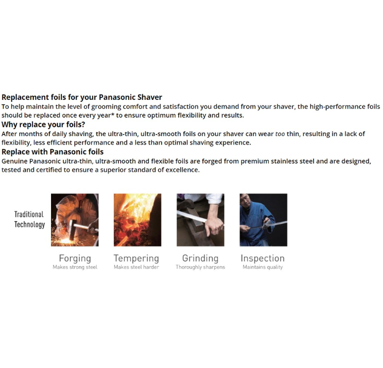 * Thay lưỡi dao và lá cạo để có hiệu suất cạo tối ưu : Theo thời gian, lá trên máy cạo râu Panasonic của bạn sẽ quá mỏng và lưỡi dao sẽ bị cùn và rỗ; Thay lưỡi dao và giấy bạc 1-2 năm một lần đảm bảo cạo râu êm ái, thoải mái
