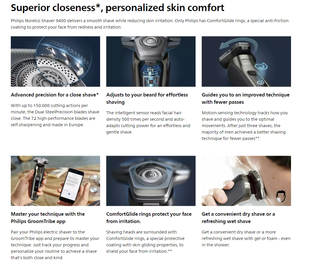 Đầu cạo được bao quanh bởi các vòng ComfortGlide, một lớp phủ bảo vệ đặc biệt với đặc tính lướt trên da, để bảo vệ da mặt của bạn khỏi bị kích ứng. **