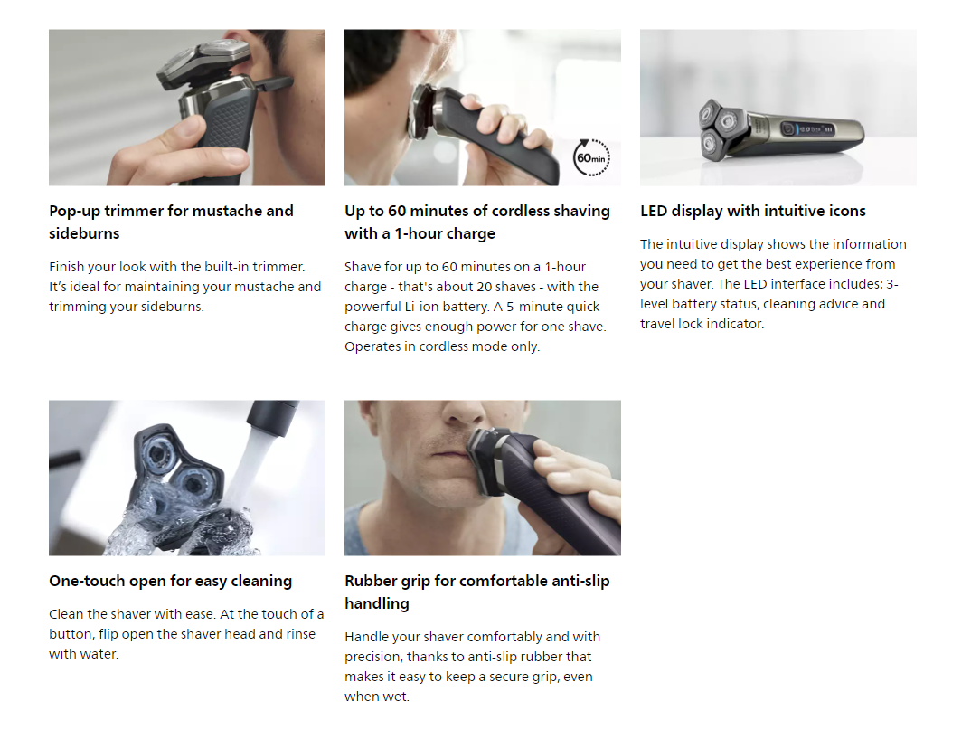 * Lên đến 60 phút cạo râu không dây với 1 giờ sạc