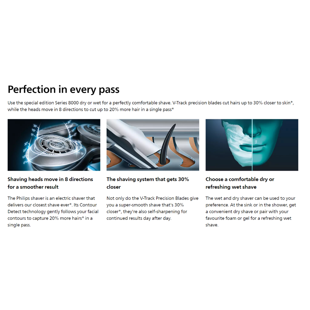 Sử dụng phiên bản đặc biệt Series 8000 khô hoặc ướt để cạo râu hoàn toàn thoải mái. Lưỡi dao chính xác V-Track cắt lông gần da hơn tới 30%*, trong khi các đầu di chuyển theo 8 hướng để cắt nhiều lông hơn tới 20% chỉ trong một lần*