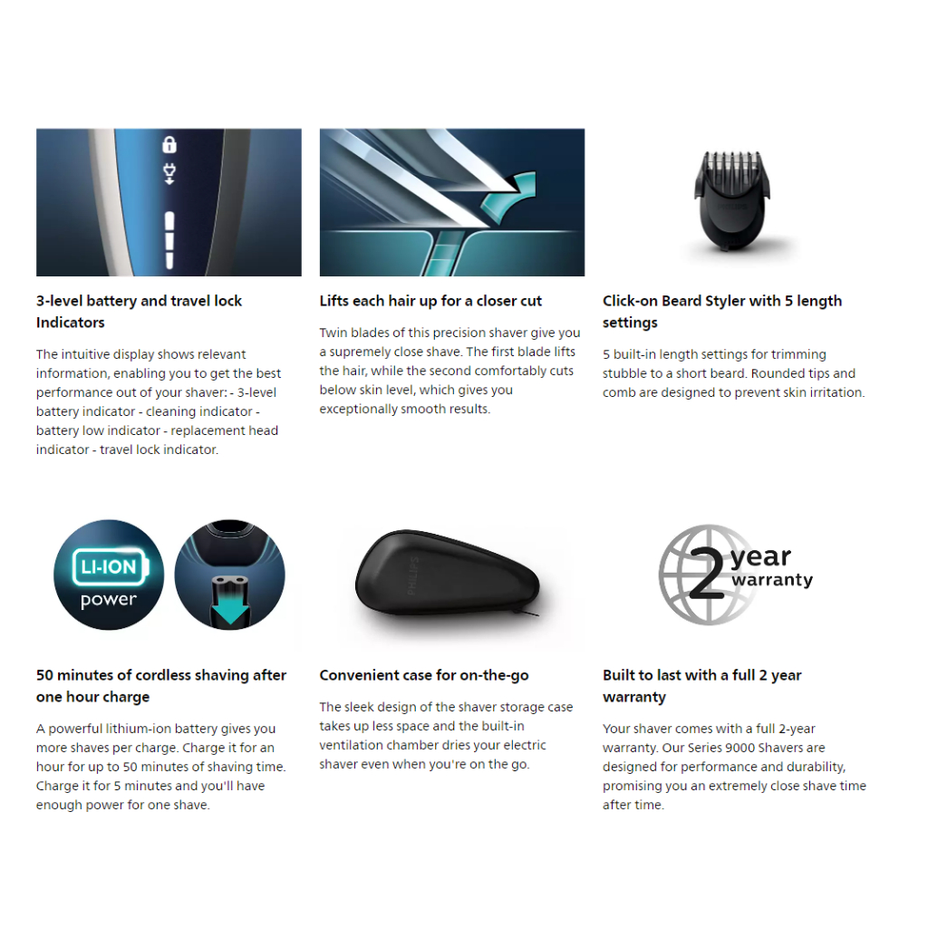 Máy cạo râu của bạn được bảo hành đầy đủ 2 năm. Máy cạo râu Series 9000 của chúng tôi được thiết kế để mang lại hiệu suất và độ bền, hứa hẹn cho bạn khả năng cạo râu cực kỳ kỹ càng sau nhiều lần cạo.