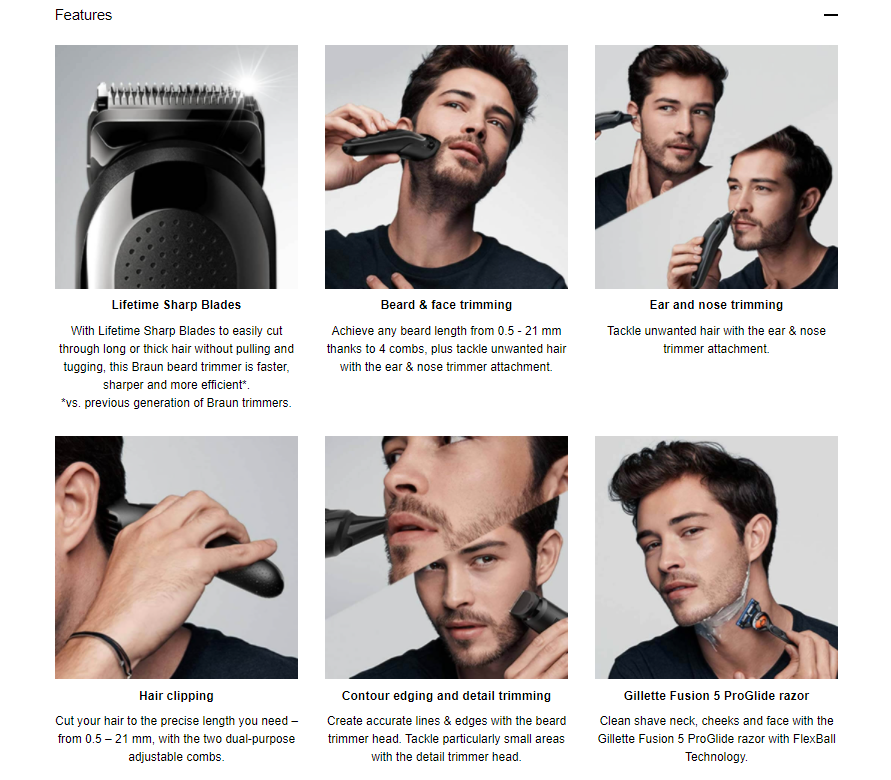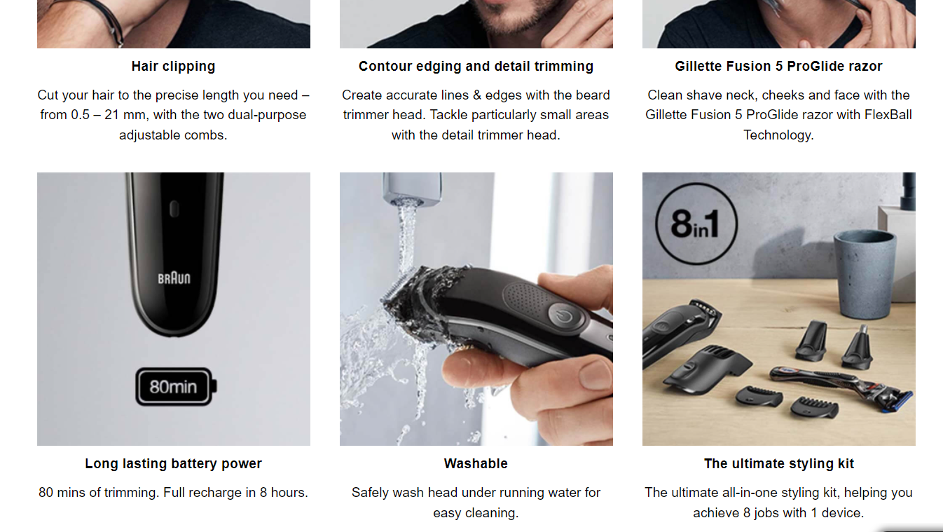 Với Lưỡi dao sắc bén suốt đời để dễ dàng cắt tóc dài hoặc dày mà không cần kéo và giật mạnh, máy tỉa râu Braun này nhanh hơn, sắc nét hơn và hiệu quả hơn đấu với. thế hệ trước của tông đơ Braun.